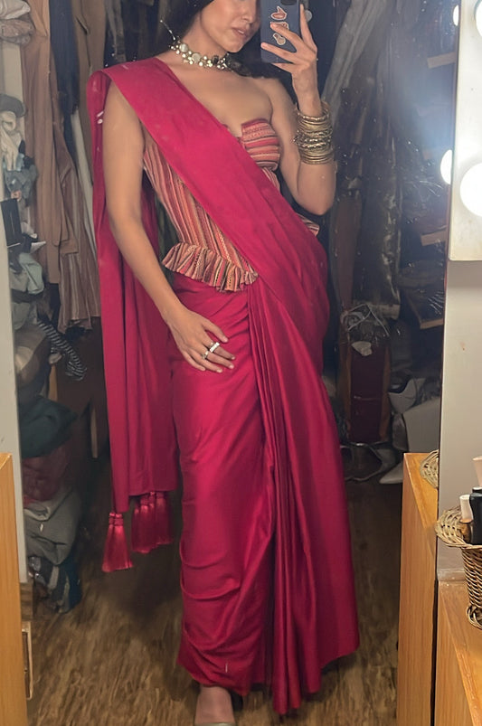 Unstitched Tassel Saree in Magenta