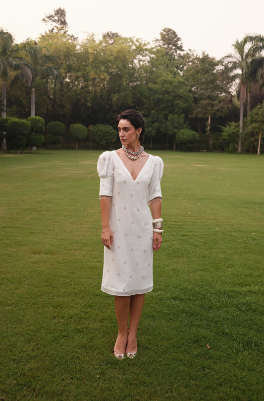 Diana - Puff Shoulders White Embroidered Dress