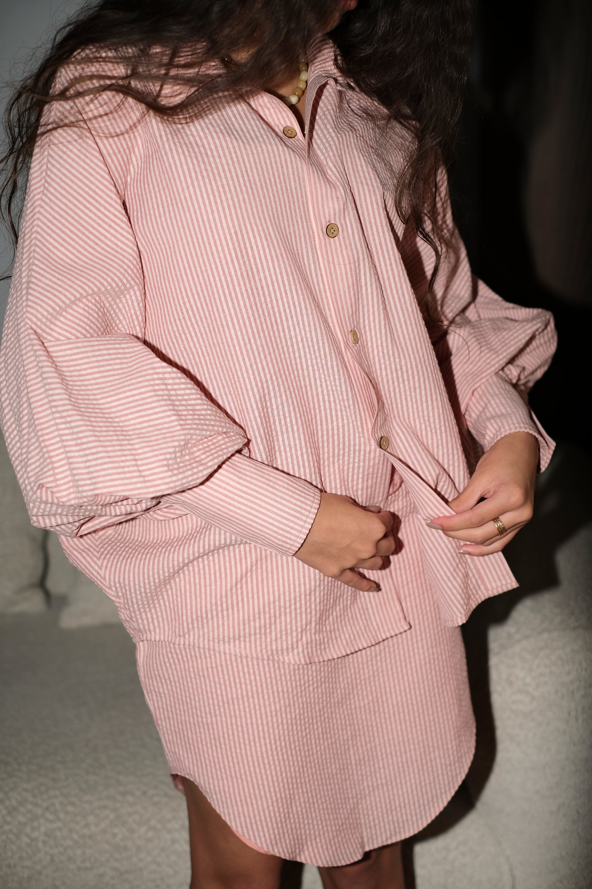 The shirt that lives in that perfect sweet spot between borrowed-from-the-boys and completely, unapologetically feminine. Cut in a soft pink and white stripe seersucker fabric, Bella is built around one defining feature — a true batwing construction where the body and sleeves are cut from a single, uninterrupted piece of fabric with no seam, no armhole, nothing between you and that impossibly fluid, dramatic drape.